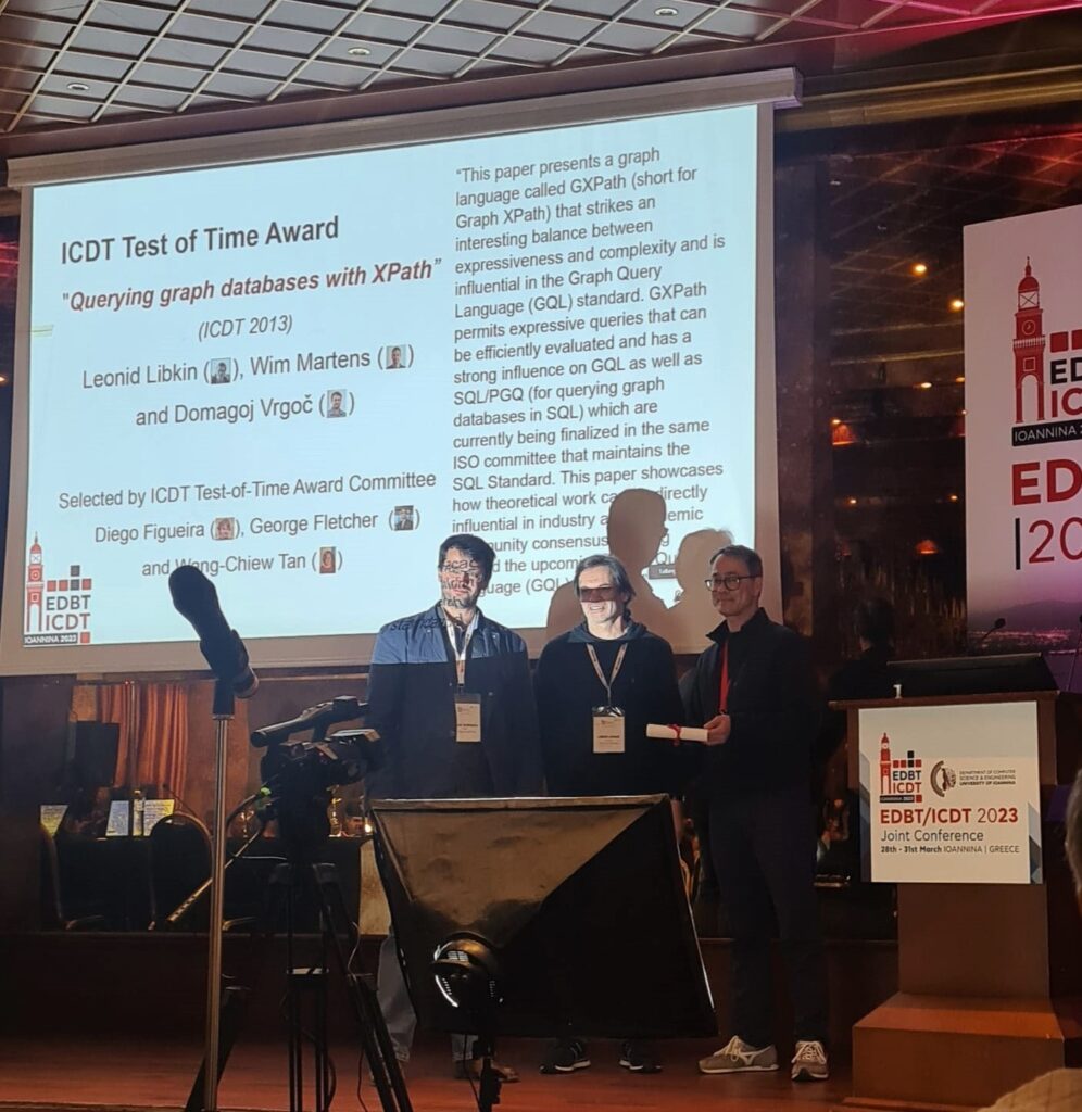 El premio “Test of time” fue instaurado en 2013 por parte de los organizadores de ICDT, con el fin de reconocer las investigaciones presentadas durante la década anterior a cada una de las ediciones de la conferencia y que, tal como lo indica su nombre, han resistido de mejor manera el paso del tiempo. En la 26ª versión que se efectúa hasta este viernes 31 de marzo, se decidió reconocer dos papers que han tenido el más alto impacto en términos de investigación, metodología, contribución conceptual o transferencia al campo práctico durante los últimos diez años: uno de ellos es precisamente el estudio elaborado por Vrgoč junto a Leonid Libkin (U. de Edimburgo, Escocia) y Wim Martens (Universidad de Bayreuth, Alemania).