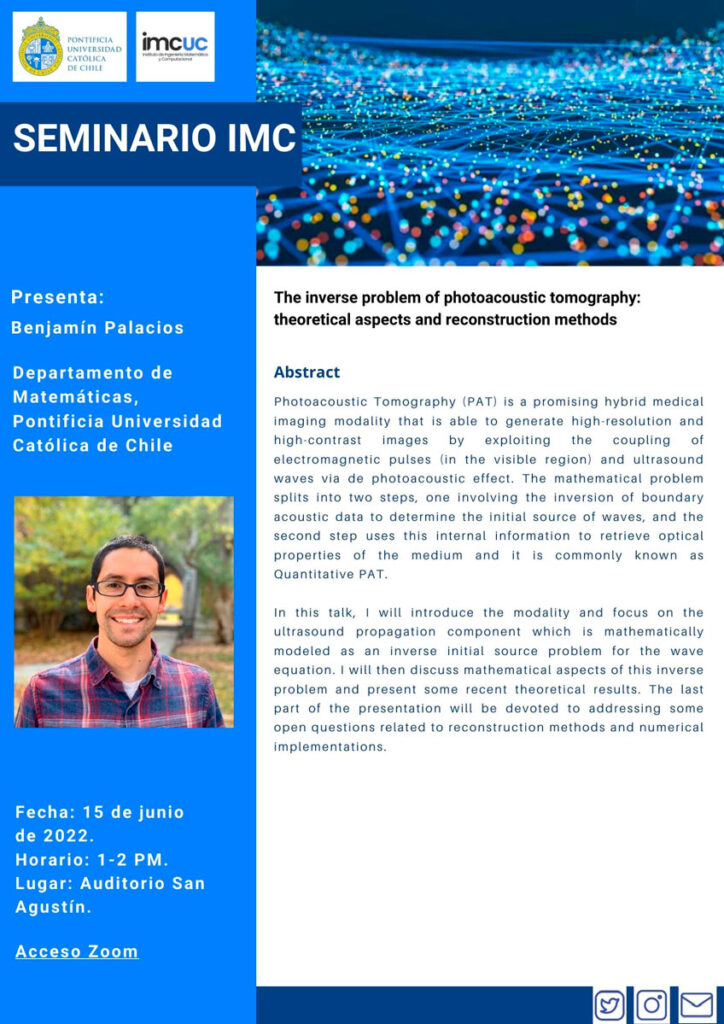 Benjamín Palacios es Profesor Asistente de la Facultad de Matemáticas de la Pontificia Universidad Católica desde agosto de 2021. Después de estudiar ingeniería matemática en la Universidad de Chile, obtuvo su grado de doctor a principios del 2018 en la Universidad de Washington bajo la tutela de Gunther Uhlmann, y posteriormente realizó un postdoctorado como parte del programa de matemáticas aplicadas de la Universidad de Chicago. Su línea de investigación se enfoca mayoritariamente en el estudio teórico de problemas inversos que surgen de aplicaciones a imágenes médicas y geofísica, por medio de herramientas provenientes del análisis funcional y el análisis microlocal.