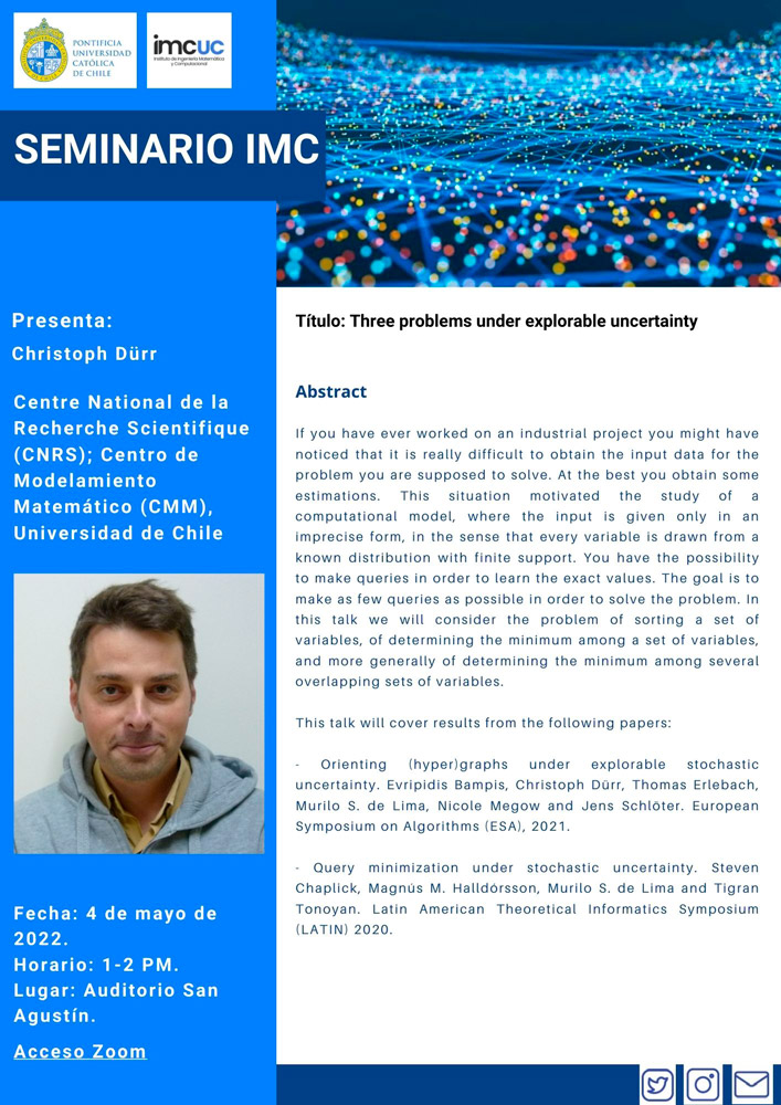 Christoph Dürr graduated in 1996 from the University Paris-South on quantum cellular automata. He worked mainly in discrete tomography, algorithmic game theory, scheduling and online algorithms. Today he is a senior researcher at CNRS, usually affiliated with Sorbonne University, but during 2022 affiliated with CMM, Universidad de Chile.
