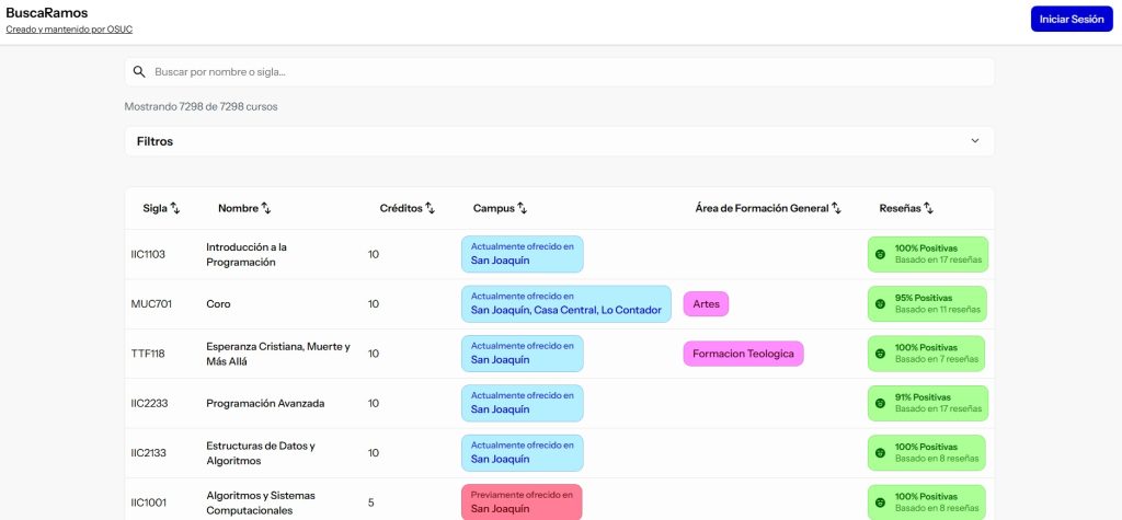 Otro de los proyectos creados por Open Source UC se llama BuscaRamos y funciona como una plataforma para que los estudiantes comenten los cursos que dicta la UC. El sistema incorpora, hasta ahora, más de 7.200 cursos desplegados en un menú que muestra el campus en el que se dicta cada uno, sus créditos, si pertenece al área de formación general y el índice de reseñas positivas.