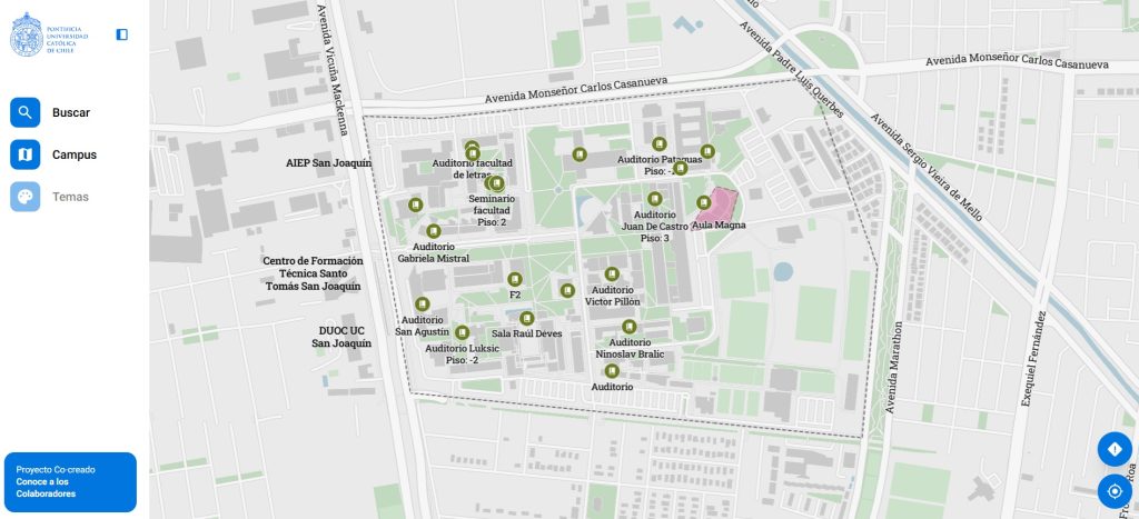 El alumno pronto se dio cuenta que no era el único al que le costaba ubicarse en el campus más grande de la UC y que hoy cuenta con más de 70 edificios, 13 facultades más el College, y más de 22 mil alumnos. Las instalaciones albergan además múltiples jardines, canchas deportivas, gimnasio y piscina, además de varias bibliotecas y casinos, por lo que a veces es fácil desorientarse a la hora de dirigirse hacia una sala o auditorio. Esa realidad llevó a Vicente y a varios de sus compañeros a desarrollar un proyecto que tras mucho tiempo de trabajo hoy es una realidad: Ubícate UC, un completo mapa que funciona a través de una plataforma web y una app para móviles que se actualiza constantemente con referencias de salas de estudio, bibliotecas, baños, lugares para tomar agua, tiendas y estacionamientos, entre múltiples otros lugares que se alzan tanto en San Joaquín como en los demás campus de la universidad.